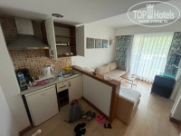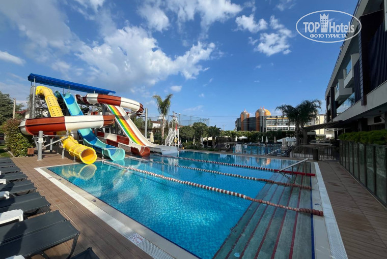 Территория объединена с 4* отелем, именно в нём единственный бассейн, который хоть как-то подогрет и горки для взрослых детей. Там у бассейна можно пользоваться и баром. На территории 5* 2 больших бассейна и 2 детских холодных, небольшая сцена для анимации, детский клуб работает 2 часа до обеда и 2 после, вечером детская и взрослая анимация стандартная как везде. Дискотек нет и по-близости в других отелях не было, всё для семейного спокойного отдыха как мы и хотели. Отдыхающие 80% англичане с детьми, немного немцев 1-2 семьи поляки, и 2 семьи из России. Все с детьми, других не видела. Алкоголь мы редко пьем, муж пробовал виски, оказался оригинальный ДжимБин, остальное всё было местного разлива. Вино 1 раз попробовала - ужас, даже наши вина получше будут, но англичане умудрялись смаковать это вино на обед и на ужин.
