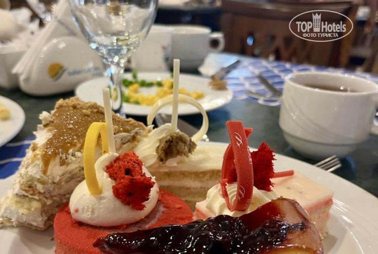 Это конечно нечто…! Здесь есть по-моему все 😀 и гриль и отварное, и тушеное, и жареное, кебаб . Говядина, курица, баранина, куропатки, морепродукты: креветки, кальмары, крабы, семга на пару просто бомба!!! Прочая рыба. Семга малосольная это тоже необыкновенно вкусно!! Я ни в одном ресторане не пробовала такую! Овощи, макароны, картошка, рис.. Любой гарнир на выбор! Утром готовят каши на молоке: овсяную, рисовую и прочее и яичница в любом исполнении для малыша - самое то!!!! Очень вкусные и разнообразные десерты. На утро готовят венские вафли, блинчики. Пончики, слойки, пирожные, печенья, чизкейки… ну очень большое разнообразие. На утро разливают свежевыжатые соки: манго, клубника и апельсин - просто потрясающе! Наш малыш был счастлив! 🙂 кофе, чай. Чай можно заваривать в чайнике, с лаймом, апельсином, имбирем.