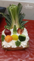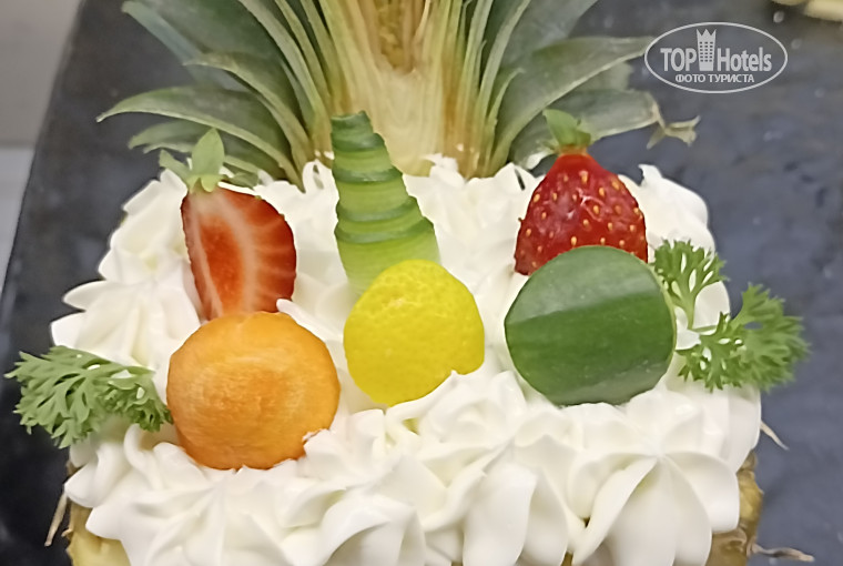 Красиво смотрится огромное количество ананасов, перцев, листьев салата, укропа, петрушки. И это только украшения! Еда разнообразна, постоянно что-то новое, готовят также бутерброды, шаурму.