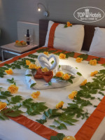 Отель производит хорошее впечатление с первых минут пребывания в нем.Прилетела в 9 утра,в 11 уже была в отеле.Заселили быстро.Номер на 4 ом этаже,с видом на бассейн,просторный,чистый,с большим балконом.Дали пляжную сумку и на следующий день попросила халат,тоже принесли.В номере чайник,посуда,чайный набор(пополняли),3 кровати,кресло со столиком,очень вместительный шкаф,вешалок много,холодильник с соком,минералкой,лимонадом,телевизор(5 русских каналов)тумбочки.Сантехника отличная,очень сильный напор воды,санузел просторный,хороший фен.Одно большое НО.Дозатор с мылом висит неудобно,над полом справа от раковины,низко.В душевой кабине дозатор полупустой с гелем.Совет:шампунь возьмите свой и обыкновенный кусок мыла на все случаи жизни.Постельное бельё приятное,кровать удобная.Уборка хорошая.На балконе 2 кресла,столик,сушилка.Вообщем,номер прекрасный!!!