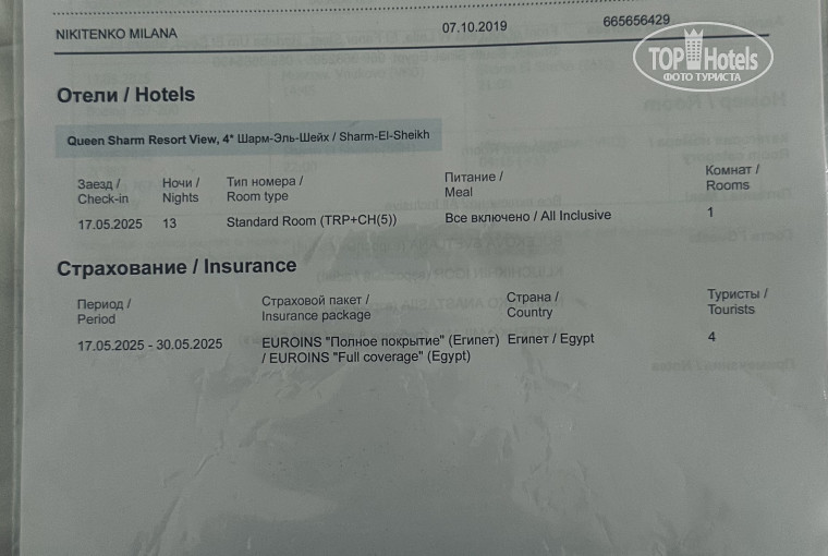 Оценка сервисов отеля автором