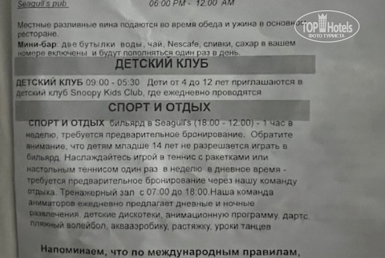 ЕДА. Есть что поесть, но без изысков и не всё вкусно. Завтрак, обед, ужин в основном ресторане. В баре на пляже есть время перекуса: пицца, гамбургер, картошка фри. Мороженое на пляже и у бассейна с 13:00. На ужин в ресторане тоже дают. Алкоголь невкусный. Есть платный бар у моря там неплохие коктейли, бутылочное пиво. В ресторане на ужин есть детский стол, но это - одно название. Самое грустное - это то, что все фрукты были неспелые: зеленые бананы, зеленые дыни, зелены персики….((( Есть 2 ресторана А ля карт, записывайтесь сразу. Мы были в Ливанском, в Итальянском не было мест. В ливанском вам будут настоятельно предлагать микс, лучше выбирайте каждый себе блюдо. В миксе в основном курица будет. Очень вкусный говяжий стейк.