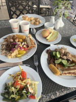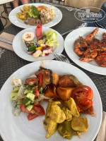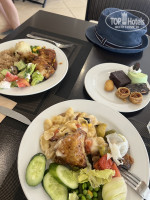 Мясо: курица и говядина в разных видах (в панировке, на гриле, печеная, тушеная). Рыба в кляре, на гриле. Креветки, кальмары и осьминоги были два раза. Хороший выбор гарниров: Рис двух видов, картофель печеный и фри, макароны нескольких видов, кускус.