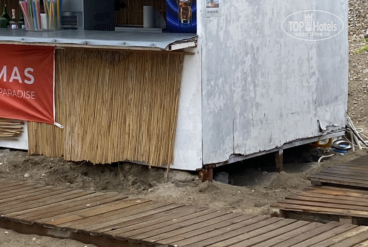 Пляж. Протяженный, чистый, лежаков много. Деревянные настилы-дорожки кончаются, не дойдя даже до середины пляжа. Шезлонги пластиковые с мягкими дерматиновыми матрасами (не люблю такие). Не поленитесь, посмотрите мое фото бара на пляже. Более унизительного зрелища для гостя «5-ки» трудно представить.