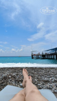 На территории есть площадка для детей, большой взрослый и маленький детский бассейны. Спортивная площадка. Настольный теннис с облезлыми ракетками и провисающей сеткой. Площадка для пляжного волейбола. Фитнес зал очень примитивный. Пляж - крупная галька, ноги больно при заходе. Имеется пирс, можно нырять или спускаться по лестнице с него. Вода чистая, прохладная, соответствовала сезону ( конец мая начало июня) Шезлонгов на пляже хватало. У бассейна после завтрака всё занято. Много просто завешано полотенцами. Есть магазин при отеле с сувенирами, цены нормальные. Справа при выходе из отеля в минутах 20 ходьбы аутлет, слева ТЦ, в минутах 10.