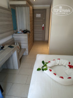 Прилетели в 7.30 утра. Пока всех собирали, пока доехали, уже 12 часов.Заселились, пошли на обед.Номер достался ну очень маленький, на 4-м этаже, но кажется, у них на эту сторону все такие, зато всё работало и с видом на море и на бассейн.В телевизоре несколько русскоязычных каналов, на балконе есть сушилка для полотенец, кондиционер работал(при открывании дверей балкона, сразу отключается), холодильник тоже нормально работал. Вода в бутылках только в холодильнике, каждый день уборщицы приносят новую.На территории есть кулеры, где можно набрать воду, но только в стаканы.Т.к. бары с 10 утра, мы брали с собой на пляж бутылочку с водой. Ложили раз шоколадку на кровать, второй раз 50 лир, уборщицы вертели нам всяких лебедей на кровати.Чайника и тапочек в номере нет, никаких бутылочек с шампунем не приносят, зато есть бесплатный сейф.Ключ-карту от номера не храните с телефоном, у нас два раза размагничивалась, на ресепшен восстанавливали.