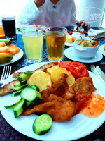 Разнообразное. Есть детское меню. Мясо, рыба, морепродукты - в любом виде ( жареные, пареные, на гриле ) были ежедневно. Всё вкусно. Много различных тортиков, пироженое в различных вариациях, печенье. Из фруктов - два вида дынь (очень вкусные), финики, инжир, арбуз, манго, апельсин и слива. Было, тематическое меню, например на ужин - День манго, рыбный день (очень много морепродуктов - креветки, крабы, кальмар, устрицы. Есть ресторан а-ля карт, в который можно сходить по специальному ваучеру, который выдаётся при заезде. Там тоже можно выбрать из меню морепродукты, но посетить этот ресторан можно только один раз. Короче, с питанием там всё хорошо, голодными не будете.