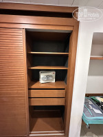 Сам шкаф местами обшарпанный. Вешалок 5 штук на всех. Сотрудник долго копался с сейфом (заедал замок), но так и не исправил.