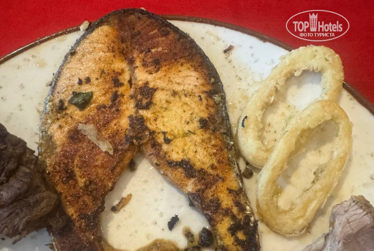 Еда тут шикарная, каждый вечер разнообразные кухни, очень много мяса, рыбы, были креветки, красная рыба, роллы, фрукты арбуз, дыня, виноград и много много всего)))сладости разные ,есть восточные, печенье, тортики, выпечка по утрам это отдельная сказка, голодным тут остаться просто не реально, очень много баров где можно просто перекусить что бы не ходить в ресторан, картошка фри, пицца, хот-доги, гамбургеры, мороженое каждый день))