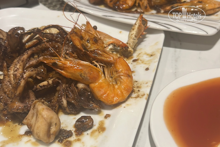 Питание выше всяких похвал: ежедневно в меню были морепродукты, курица, рыба, мясо — выбор разнообразный, еда вкусная и свежая. Особенно понравился ресторан «Антика» — блюда там просто восхитительные, очень рекомендуем посетить.