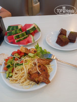 Утром каша рисовая, она без вкусная но мы добавляли кому соль, кому сахар, омлет, яичница, вверенные яйца. Обед была курица в разных вариациях, рыба, говядина, много очень овощей, из фруктов яблоки, дыни, арбузы, очень вкусные либо мандаринки, либо это маленькие апельсины. Один день попались сливы. Ужин так же. Один день так попало, что мы ушли с пляжа раньше и проходя мимо столовой,(она была закрыта) стояла большая очередь в неё. Мы пошли через минут 15 и не хватало столов, везде были большие очереди. Люди просто с ума сходят, ворчали что им еды мало, не чего есть. Мы пришли через час и было всего навалом, и свободные места. Видимо они думают что потом ничего не будет, но было на оборот.