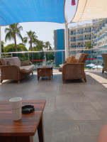 На пляже работает бар, с 11 часов кормят картошкой фри, нагетсы, бургеры , фрукты и овощи. Напитки соки, газировки и автомат с кофе. Кофе кстати очень вкусный, именно кнопка -кофе с молоком. Капучино, лате не зашло.