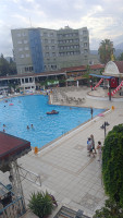 Территория очень зелёная ,красивая . На территории 2 бассейна . Детский бассейн очень холодный и работают только 2горки из 3х. Взрослый бассейн глубиной 150,теплее ,чем детский. На территории бассейна есть снек бар ,мороженое с 12до15, делали лепешки . Так же бар с алкогольными ,не алкогольными напитками ,чай,кофе,айран.