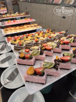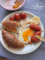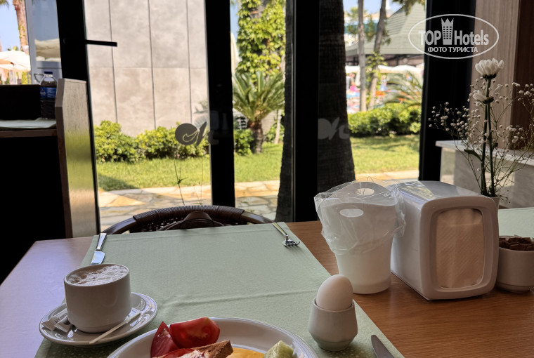 Начнем с заселения, привезли нас в отель около 10 утра, на ресепшен нас встретил, отлично говорящий по русски, сотрудник, браслетов в данному отеле нет, поэтому нас сразу отправили на завтрак, чемоданы оставили там же на ресепшен, после завтрака сказали подойти. Зайдя в ресторан, были приятно удивлены его размерами, ресторан очень большой, разделенный на зоны, мы всегда сидели в зале перед выходом на террасу, очень чисто, я ни разу не увидела грязную посуду или же грязный стол. Только отставляешь тарелку на край, её тут же забирают. Мы попали на поздний завтрак, выбор был уже невелик, но мы нашли что поесть, яйца, сосиски, тосты. Так же всегда на завтрак, обед и ужин, к тебе подходит персонал и спрашивает что ты будешь пить, приносят заказанный напиток, очень удобно.