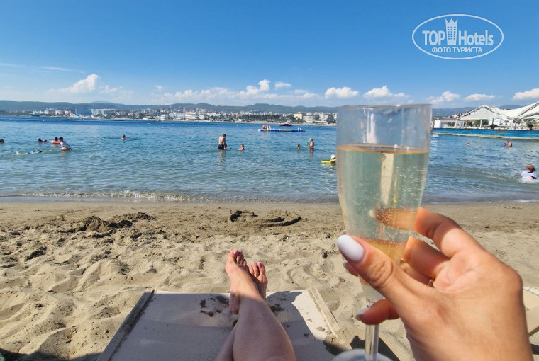 И на этом пляже шезлонги другие, современнее и помягче. Здесь рядом пляжный бар, в котором можно взять игристое, пиво, а также мороженное.