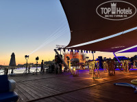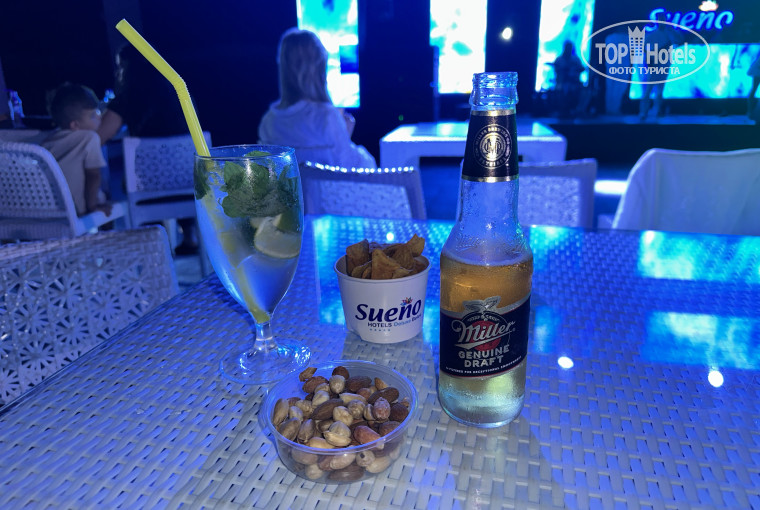 Пляж и примыкающая к нему зона. Своего пляжа у Sueno Golf нет, но и надобности в нем тоже нет, ибо вполне достаточно общего с Sueno Deluxe пляжа. Прибрежная полоса широкая, лежаки установлены под тентами, места настолько много, что часть пляжа просто стоит без лежаков. Заход в море плавный, песок. Детишки охотно строят замки из песка. При входе на пляж с правой стороны обновили санузел, именно так. Ибо там есть как туалетные комнаты, так и душевые, вода горячая холодная, помещение кондиционируемое. С левой стороны - бич бар, там же около расположена зона приготовления гезлеме. Работает с 12 до 17, тут же со свободным доступом холодильник, в нем айран, вода. С нашей субъективной точки зрения самое удобное и потрясающее сооружение на пляже - пирс. Выдает в море достаточно далеко, кайф просто находиться на нем в жаркую погоду, когда обдувает свежий морской ветер, оборудован ну всем, чем необходимо: в достаточном количестве лежаки, столики с диванчиками, открытая душевая, кабина для переодевания и посреди всего этого великолепия – бар. Ассортимент напитков - не перепробовать всего и не описать: софт напитки, чай, кофе, причем в различных исполнениях, безалкогольные напитки в банках, напитки-энергетики, соки, айран тут тоже есть. Далее: пиво в стекле 4 вида, ликеры различные общемирового уровня и качества, наливалось все натуральное и по вкусу такое же. Виски, водки, бренди, коньяки, текиллы и прочее, прочее. Заказывали коктейли, делают, но как-то незатейливо, карта напитков лежит вот она на стойке, можно ткнув пальцем, что-то заказать, намешают. Тут же подают чипсы, ореховые смеси, качество и состав отличные (сравниваем с орешками, какие подавались в других отелях подобной ценовой категории). Подача напитков в белых, а иногда в прозрачных, пластиковых стаканах и фужерах. Работает бар с 10 и до…. Мы уходили довольно поздно, позже 19, напитки брать было можно.
