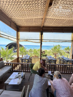 Кафе на пляже - там система заказа по меню и потом заказ приносит официант, а напитки сам берешь в баре, где есть небольшая очередь. Вода стоит в холодильнике в открытом доступе. Есть один официант, который просто игнорирует сделать заказ, будет смотреть в глаза и проходить мимо, не реагируя ни на что. А остальные все сотрудники норм вроде на пляже. Сама еда съедобная, голодными не ходили там, т.к. на обед 1-2 раза за отпуск сходили в отель только. Еще сидит женщина, лепешки печет, брали 1раз на пробу, нам не зашли, так еще и нагло чаевые просит, было бы еще за что))