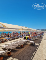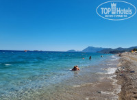 5. Пляж. Идти до пляжа минут 7 по тенистой аллее, или можно доехать на шатле. Пляж оборудован тентами и лежаками, места свободные были в основном на 3-4 линии, приходили пол 9 утра. На пляже есть бар и ларек с гамбургерами, куда выстраивается длинная очередь, но все вкусно, особенно понравился гамбургер с рыбой. Море чистейшее, видно каждый камушек и куча рыб. Даже после шторма в нем ничего не плавало, если и бывал небольшой мусор, то от выброса ближайших катеров и кораблей. Заход в море - крупная галька, ногам больно, но привыкаешь.