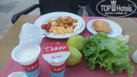 С 12:00 также можно покушать в снек баре, гамбургеры, пицца, картошка фри, луковые кольца, спагетти, мясное блюдо, салаты, сыры, фрукты-апельсины яблоки, груши, арбуз. Также на территории стряпают лепешки с разными начинками, есть бар с фруктовой водой и сладостями. В определенное время стряпают венские вафли с джемом или шоколадом, сам решаешь что намазать на вафлю. Можно нарезанные фрукты положить на вафлю. Рядом чай, кофе и столики. Можно посидеть попить чай с вкусняшкой. На территории стоит много холодильников с айраном и водой в бутылочках.