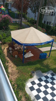 Территория маленькая, но чистая, есть детская площадка, пекли лепешки ( бабуля не приятная ) то в телефоне, то скалкой по своему телу катает, надо долго стоять что бы получить эту лепеху. в бассейн и на горки не ходили- там народу много всегда, но место можно найти, есть детская анимация (каждый день одно и тоже, но деткам нравилось), а потом играет музыка возле бара.