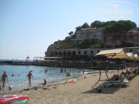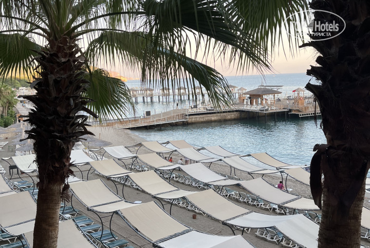 Пляж – чистый песчаный и с плавным заходом в чистое море. Лежаков и зонтиков в достатке, лежаки все как всегда занимают с утра, но мы и в 11 дня находили свободные на четверых. Есть пирс, с которого можно заходить по лестнице на глубину, а также прыгать. Работают спасатели, вопрос безопасности закрыт.