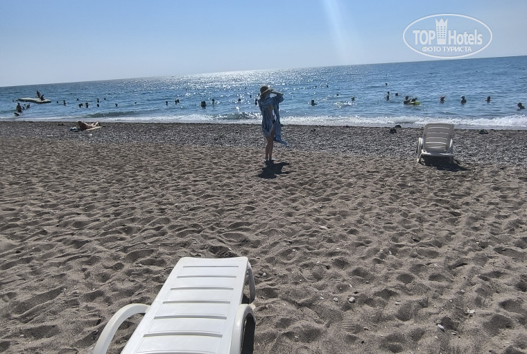 До моря спокойным шагом 10-15 минут. Если не хочется ходить, есть автобус, который возит на пляж и обратно каждый час. Мы ходили сами в 8-9 утра и в 5-6 вечера:) Пляж отеля обозначен флажками, есть лежаки и навески, пляжный бар с 10 до 18, где можно взять воду, газировки. Лежаков нам хватало, т.к. мы не лежали, а плавали. Одного лежака на троих, чтобы оставить вещи и полотенца, вполне хватало.
