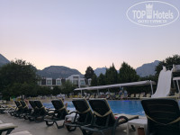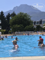 Бассейн чистый, с живописным видом на горы. Есть лежаки и навесы от солнца.