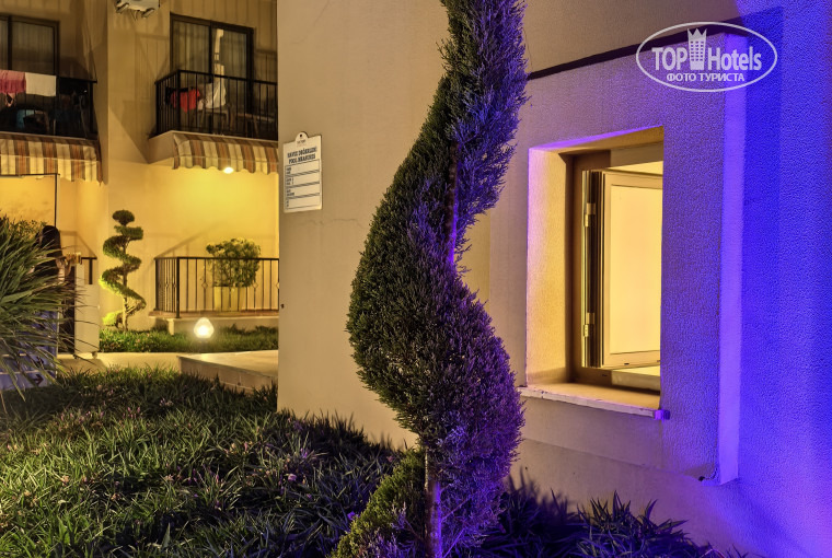 Сам отель состоит из 6 корпусов, в 1-м (главном) расположены ресепшн (с круглосуточным баром), столовая (с баром), ресторан а-ля карт (на 2-м этаже) и диско-клуб в подвале. Второй и третий корпуса четырехэтажные (3+мансарда), а четвертый, пятый и шестой пятиэтажные (4+мансарда). Номера в этих корпусах можно разделить на 3 типа. Основные - однокомнатные 24м2, двухкомнатные 33м2 (расположены на мансардных этажах) и семейные улучшенные 40м2 (но их очень мало). У однокомнатных балконы с металлическими перилами, могут выходить как на бассейн, так и на противоположную сторону от отеля на проселочную улочку. У двухкомнатных, расположенных на мансарде вид непосредственно вниз ограничен, а также прямо на балконе расположены два внешних блока сплит систем. С одной стороны это минус т.к. уменьшает пространство и без того небольшого балкона, с другой, напротив этих блоков вещи очень быстро сохнут.
