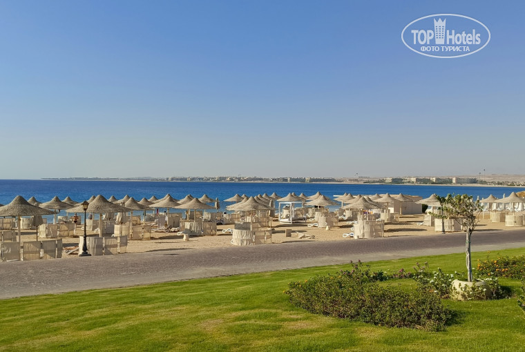 Широкая песчаная полоса пляжа обеспечивала достаточное количество свободного пространства даже в часы наибольшего наплыва отдыхающих.Лежаками пользовались свободно,недостатка в них не испытывали.Что касается моря,оно действительно радует прозрачностью воды, отсутствием волн и удобным плавным заходом.Отливы совершенно не ощущались,как это было в других отелях.У того же отеля Гравити находящегося неподалеку в Сахль- Хашиш,море просто исчезало во время отливов.Подводные рифы добавляют эстетического удовольствия,привлекая морских обитателей,которыми можно полюбоваться.Единственным недостатком в этой идиллии является присутствие надоедливых мух на пляже.Служба спасения работает безупречно,её сотрудники