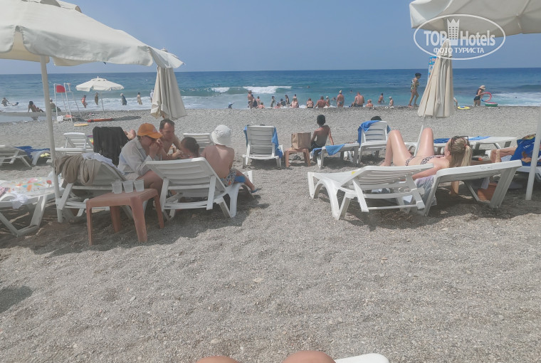 Выход к морю из отеля, на пляже достаточно шезлонгов для гостей, спасатели на пляже и охрана, бар на пляже, море чистое, красивое.