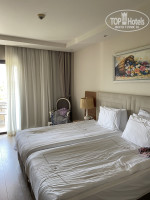 Номер брали в главном корпусе с частичным видом на море. Жили в номере 1451 с хорошим видом на море и стройку. Было очень тихо, шумоизоляция очень хорошая. Никакого презента за повторное посещение не было, хотя об этом сказали девушкам гетс релейшн. Очень просторный номер, свежий ремонт, мебель вся хорошая, чайник и набор для чая/кофе, сейф, минибар (минералка, вода, газировка, кола 2, фанта, спрайт, липтон, энергетик, сок 2, пиво, чипсы, вафли, кекс, соленые палочки к пиву).