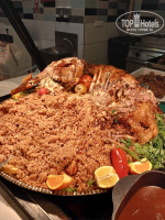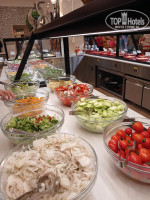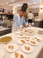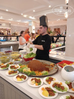 основной *Crystal Restaurant (7-11:00-завтрак,12:30-14:30-обед,18:30-21:30-ужин).Готовят вкусно. Для 5ки я бы сказала. что ассортимент не велик. Было все и рыба, и мясо. и птица, но мало видов .Были супчики. Много видов специй. соусов, различных приправ. Большой выбор овощей, зелени. Оливки в большом ассортименте. Готовили даже салат Оливье. Много вкусной выпечки. Халва ,Мед в сотах. Лукум, Пахлава. Различное варенье :из лепестков роз, из баклажанов. Была даже фаршированная груша. Из фруктов: арбуз, дыня. бананы, груши. яблоки. сливы, нектарины, персики, виноград. Шашлык, рыбу и овощи запеченные на гриле готовили рядом с рестораном в Grill bar.Также была и диетичекая пища-отварные и парные овощи , рыба, мясо. На ужин на столы стелили скатерти, в остальные часы просто бумажные салфетки.