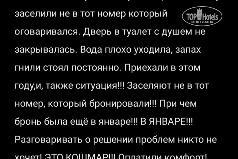 Место вроде не плохое, но отношение к туристам оставляет желать лучшего. Второй год пытаемся тут отдохнуть. В прошлом году заселили не в тот номер который оговаривался. Дверь в туалет с душем не закрывалась. Вода плохо уходила, запах гнили стоял постоянно. Приехали в этом году,и, также ситуация!!! Заселяют не в тот номер, который бронировали!!! При чем бронь была ещё в январе!!! В ЯНВАРЕ!!! Разговаривать о решении проблем никто не хочет! ЭТО КОШМАР!!! Оплатили комфорт! Заселяют в стандарт!!! Почему??? ОЦЕНКА ---- 5 ЗВЕЗД!!!