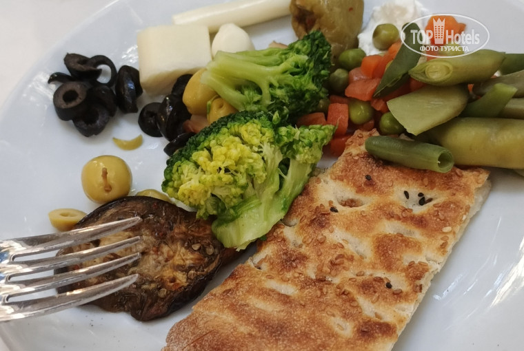 Теперь главное, что всех волнует, судя по отзывам - еда. Еды много, всякой - да, без раков и креветок, но с рыбой. Пару раз успевали на пахлаву. Несколько видов хлеба, сыров, даже косичка, оливок. Всегда есть суп, всегда есть курица, рыба, один раз был тунец, но нам с непривычки вкус не понравился. Для детей оладушки, для взрослых пита, с самыми разным и начинками. Арбузы, дыни - ежедневно.