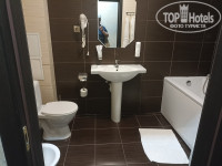 В санузле есть аж биде. ОГРОМНАЯ ванна, просто гигантская, слона утопить можно, даже я с ростом 182 залезал в нее с трудом, что уж говорить про более низких людей. Это же и недостаток - надо бы было предусмотреть какую-то лестницу или что-то подобное. В ванне - набор из лучших душевых кабинок - душевая лейка на шланге, лейка "тропический дождь", отдельно труба для наполнения ванны. Опять мелкий недостаток - труба для ванны сильно выступает из стены, а лейка на шланге расположена так, что при мытье шланг постоянно цепляется за ту трубу, несколько неудобно. И шторка на телескопической распорной между стенками штанге - обращаться стоит аккуратно. Напор воды аж с ног сбивает. Ванная - высший класс. При заезде выдается полный гигиенический набор (паста, щетки, шампуни, гели для душа, мыло), полный набор полотенец (которые меняют почему-то КАЖДЫЙ ДЕНЬ, хоть мы и не просили, но за это спасибо), банные халаты, тапочки.