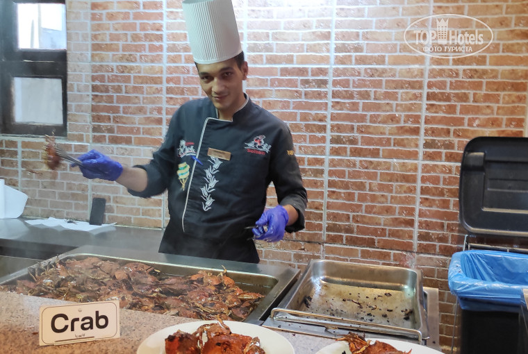 Питание: вроде бы все хорошо, но иногда приходишь на обед и выбор очень скудный, из мясо курица и рыба. Из морепродуктов за время отдыха были один раз кальмары с овощами и один раз крабы. Очень большой выбор приготовленных овощей. Завтраки стандартные, как во всех отелях. На ужин ассортимент блюд побольше - была и говядина всегда, один раз была утка. Если не успели прийти на обед или ужин в первые пол часа, то столик сложно будет найти, нужно ждать пока освободится место - раньше с таким не сталкивались. Официанты молодцы - приносят напитки, сразу убирают, помогут найти столик.