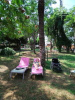 Территория. Большая, много зелени, много тени, много фруктовых деревьев. Перед входом на пляж стоит стенд, где написано, что растет и какие птицы есть на территории отеля. Это интересно, почитайте. Понравилось, что днем можно отдохнуть от солнца в тени деревьев, поспать на лежаках прям под ними, на газоне, это прям кайф. И вечером можно посидеть за столиками на улице, а не в зале ресторана. Мы ужинали на улице, атмосферно, под фруктовыми деревьями. Официанты там так же проворно обслуживают напитками, как и в зале, а может даже и лучше.