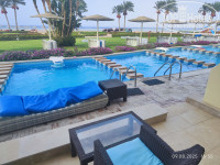 Пляж: это большой плюс отеля. Никакого понтона! Специально выбирал бухту с ветром, он спасал от духоты. Пляж песчаный (ракушечник), босиком можно, но после обеда раскаляется так, что лучше тапочки. Заход в море плавный. Аквасоки не нужны, дно песчаное, без камней. Два загона (шириной метров 60), в первом купаются с самого утра, когда море волнуется. С обеда штиль и можно купаться уже и в первом и подальше к морю во втором. Плюс после обеда можно купаться с маской, выплывая за загон вправо и насколько хватит желания или смелости. Мы плавали до угла отеля. Риф конечно слабенький, но рыбы есть, посмотреть интересно. Рыбы даже возле берега плавают. Температура воды в районе 30 градусов. Лежаков хватало, которые возле захода в море занимают в первую очередь. Мы всегда ходили подальше, там народу не было - полный релакс. При отеле есть водолазная станция - постоянно кто-то погружался на небольшую глубину. Можно заказать лодку за деньги - плавают в сторону о. Тиран. Нам очень понравилось, плавали с масками у рифов, у затонувшего корабля, видели дельфинов, много. Рекомендую. Можно покататься на сапах. Туалет в столовой при пляже (Барракуда - в ней можно перекусить днем), либо в ближайшем корпусе возле душа. Переодевалок я не нашел. Волейбольная площадка есть, в волейбол играли.