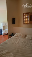 Номер был семейный вид на море. Моря особо было не видно, так как окна были на впереди стоящий корпус, да и фиг с ним, все равно весь день на пляже сидели, а ночью темень. Сам номер староват, но все работало. Горячая вода была горячая, кондиционер дул что надо ( правда был такой гул, как в самолете, зато не слышно было ничего вокруг). Планировка номера офигенная: большая кровать за полустенкой, двухъярусная кровать в уголочке, как заходишь в номер, сразу двусторонняя раковина. Унитаз за дверью, с другой стороны коридора душ. Короче 4 человека в одно и то же время могут использовать санузел никому не мешая. Плюс большая терраса с креслами и столиком с выходом на лужайку.