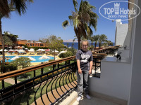 До отеля мы ехали минут 15 максимум. Заселялись мы одни, на ресепшене очень вежливый персонал, заселили нас сразу и в отличный номер, с видом на бассейн и частично море. В номере две кровати, но так как мы были с ребенком, нам тут же принесли еще одну кровать.