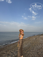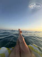 Море прекрасное, вода теплая, прозрачная. Заход вполне удобный и для детей. Пляж - песок, ближе к воде - мелкая галька, местами крупная. Пляж грязноват. Лежаки пластиковые, без матрасов, полотенце не добавляет мягкости, лежишь как будто на досках, может поэтому на пляже мало людей. Есть пирс, с него есть спуск в воду. На пляже есть зона водных видов спорта, мы катались на таблетке и на гидроцикле. Ребята делают видеосъемку с дрона, можно после катания купить видео. Оплату принимают и в рублях переводом СБП, на момент нашего отдыха курс был 84₽, а у них 90₽. На пляже есть бар, где можно выпить/перекусить в обед. Дают мороженое в упаковках. Вечером бар на пляже превращается в морской а-ля карт ресторан с видом на море, который можно посетить бесплатно 1 раз за отпуск. На горячее брали лосось и сибас. Сибас понравился больше. Кормят вкусно, но в августе было невозможно жарко, просите по возможности стол у окна, так хоть обдувает немного. До пляжа от аквапарка идти не более 2 минут через тоннель под дорогой.
