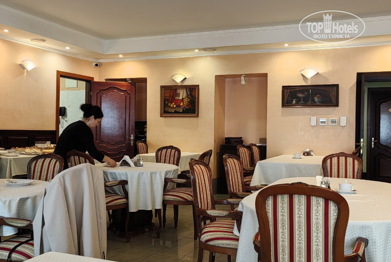 Завтрак входил в стоимость. Завтракали в ресторане на втором этаже - там тоже почти музей. Вид во дворик, красивая мебель. Сам по себе завтрак - ну... на четверку. Без изысков, и хотя были обещаны какие-то супер-пупер-сыры из местной сыроварни, на деле выбор оказался довольно скромным. Зато ассортимент соков и пирогов порадовал. А вот чтоб заказать яичницу пришлось ловить официантку. Кстати, персонал в ресторане был угрюмый, недовольный и какой-то очень издерганный на вид, хотя столиков и половины занято не было.