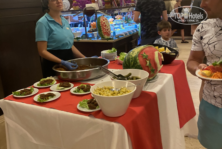 Конечно, прочитав отзывы преимущественно с подтекстом, что отель "бюджетная" 5*, а не супер-супер 5*, то ничего особо и не ждали. Питание- где хорошее, где не очень. Курица, индейка, было и мясо, язык, была и рыба. Были и соевые сосиски, соевая ветчина, непонятного вида котлетки из фиг пойми чего, стандартно-сто сыров на один вкус, соки юппи, кофе в ресторане из автомата 3в1, свежий кофе только в баре, еще постоять в очереди надо и то, бар с 10 утра.