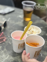 В баре у бассейнов хорошие напитки, есть импортный алкоголь и пиво в бутылках, так же можно взять снеки. Отдельно хочу отметить кофейню - очень вкусный кофе, подача и десерты. Так же в кофейне можно взять мороженое в упаковке. В целом мороженое в разном виде подают с 11 часов дня и до 9 вечера - просто рай для детей)