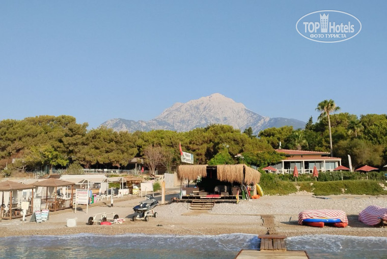 Отель находится на второй линии, поэтому до пляжа придётся чуть-чуть пройтись. Идти надо минут 7 по просторной, затенённой деревьями, улице. Чаще эти прогулки доставляли скорее удовольствие, нежели неудобства. Несколько часов в день (расписание можно посмотреть на выходе) ездит газель до пляжа и обратно с приветливым водителем (ехать там минуты 2). Сам пляж довольно просторный, чувствуется, что отель не перегружен. Всегда найдутся 2-3 свободных шезлонга в передних линиях, а на задних - вообще любое количество. Позади шезлонгов есть волейбольная площадка, где раз в день ещё играют в бочу. Стоит отметить, что пляжная анимация довольно слабая: раз в день кто-то придёт покричать, а потом люди уже развлекают себя сами. Как я уже сказал, пляжный бар оставляет желать лучшего, но он хотя бы есть. Пляжи в Кемере галечные, поэтому дискомфорт при заходе в воду имеется. Но глубина моря меняется довольно резко, поэтому нужно сделать всего пару шагов чтобы поплыть. Для решения этой проблемы можно надеть специальную плавательную обувь, но никто и без неё ни разу не поранил ноги: нужно просто, как и везде, соблюдать осторожность. Для пожилых людей имеются поручни прямо в воде. На глубине дно песчаное, ближе к берегу плавают косяки красивых рыб, которых можно прикормить хлебом из ресторана. Вода, в целом, чистая, особенно по утрам, когда волны ещё не нагнали с моря всяких водорослей и песка (даже у буйков на глубине 7-8 метров прекрасно видно дно). Больших, опасных для плавания волн не было ни разу. Рядом имеется целый клуб морских развлечений: от парашютов до дайвинга. Можно сказать, что пляж - это один из главных плюсов отеля.