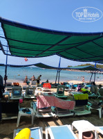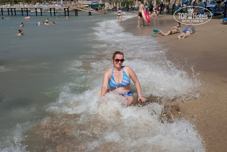 Пляж - ну, мне понятны жалобы на нехватку мест. Пляж узковат, ближе к правому краю вообще лежаки в один ряд. Вдобавок, когда море бурное, полпляжа заливает волнами. Сам пляж песчаный, заход плавный. В воде попадаются выступающие камни, можно крепко приложиться, надо быть внимательным. Есть пирс. С него можно, (официально - нельзя) нырять. Все желающие ныряют. Пирс периодически разваливается на отдельные щиты под напором волн, его периодически чинят. Почему сразу нельзя сделать нормально - непонятно. Тоже самое с уличными душами. Разболтанные, то работают, то ремонтируются. Непонятно, чего мучаться: кинули бы несколько шлангов мыть ноги - но нет, дорого-богато-супер-пупер-ол инклюзив, будут эдакие колонны из нержавейки, но дышащие на ладан. Мы проблем с лежаками не испытывали, т.к. я к 7 утра уже выходила купаться. Как раз и места занять могла. И море наиболее прозрачное, и толпы нет, и солнце не жаркое, а приятное. Самые негативные отзывы от людей, которые встают поздно. Им ни еды, ни лежаков не хватает, это факт! Ближе к центральной части пляжа в море выведен коллектор ливневой канализации, в штиль пахнет как себе. Очень удивляют туристы, которые сами и с детьми плещутся в этом «ручейке». Если волна сильная, то к вечеру в бухту приносит много мусора, утром мусор рассеивается. На территории нормальный аквапарк и два бассейна.