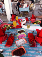 В общем, столики красиво оформлены, с лебедями. Стоит четыре плошки с разными соусами. Стоит тарелка для супа на подтарельнике, стоит две плошки с салатами (руккола и другая дребедень вперемешку, даже без масла). Тарелок под салат не дают. То есть, подразумевается, что мы должны по двое есть руками из общих мисок, макая листья в соусы? Мы использовали подтарельники. Потом принесли напитки. Наливают в бокал или газировку, или вино белое-красное на выбор (приличное, кстати), но, вот если мне налили вина, то попросить, чтоб налили ещё и безалкогольный напиток - нельзя, бокалов нет. Воды тоже на дали. Потом принесли и налили по половнику супа-пюре из шампиньонов. Вкуснее и концентрированное, чем в столовой. Ещё нюанс. Нас посадили чётко в центре трёх курящих столиков, которые, разумеется, курили почти непрерывно. В общем, в нормальном ресторане такие нюансы точно учитывают. Несколько спасало, что ужин проходил на открытом воздухе. Но, короче, мерзость! Посуду убирать не торопились. Дети строили из тарелок пизанские башни, чтобы немного освободить место. Потом ждали главное блюдо, занимаясь пассивным курением. Обещали сибаса на гриле. Когда его вынесли, мы хором сказали - это карась! Его вообще хотелось не съесть, а похоронить. Но выглядело это скорее смешно.