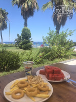 На пляже хорошее кафе, где можно перекусить салатами, арбузом, картошкой фри,женщина печёт гезлеме с мясом и сыром. Айран, вода в холодильниках на территории отеля в нескольких местах.