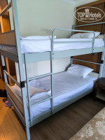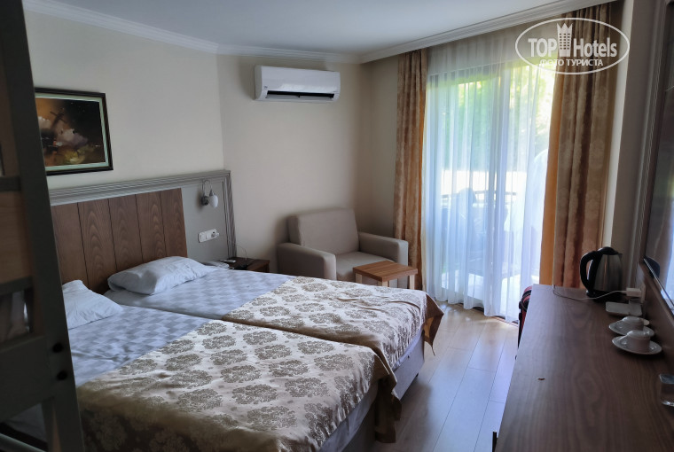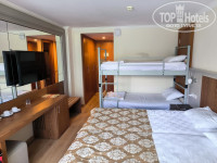 Номер Bunbed Room компактный (по ощущениям менее 20 м2, около 18-19 м2), но уютный. Детям - большая двухъярусная кровать 90х200 с хорошими матрацами, взрослым - две раздельные односпальные кровати, стоящие вплотную и образующие большую двуспальную кровать. Также есть дополнительное спальное место, кресло - кровать. В номере имеется довольно-таки просторная душевая, хороший ТВ 50 дюймов с кучей каналов, из которых около 4 на русском языке, остальные на немецком и турецком. Из минусов номера отмечу низкую шумоизоляцию, так как присутствует дверь в соседний номер, а также то, что если номер достанется с видом на основной бассейн (где горки), то каждый вечер под окнами будет шумная программа до 24:00 (это больше касается корпусов 4 и 5), так что для кого это важно имейте в виду. Касаемо двери в номере: видимо ранее это были сдвоенные номера, а теперь их разделили и дверь заблокировали. В остальном в номере все замечательно, есть кондиционер, чайник, фен, сейф, шкаф, холодильник, балкон.