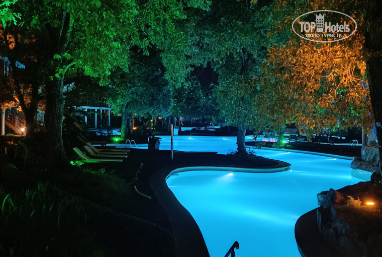 Территория отеля очень ухоженная, много зелени, цветов, тенистых аллей, зон для отдыха. Вечером включают красивую подсветку.